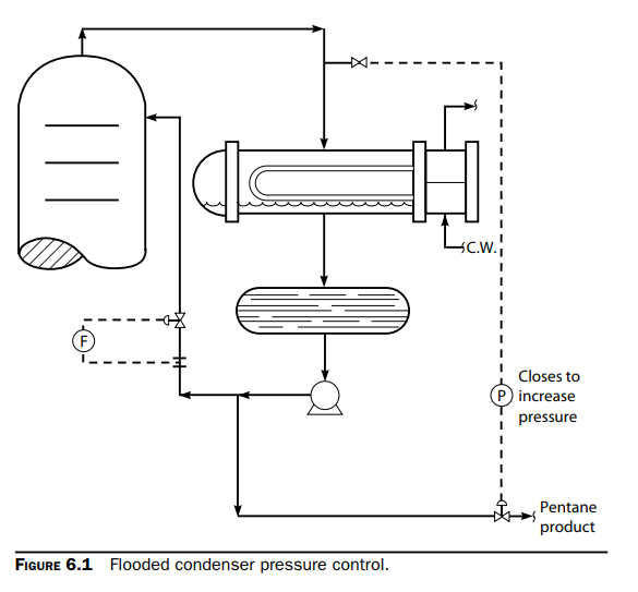 I well remember one pentane-hexane splitter in Toronto. The tower simply could not make a decent split, regardless of the feed or reflux rate selected. The tower-top pressure was swinging between 12 and 20 psig. The flooded condenser pressure control valve, shown in Fig. 6.1, was operating between 5 and 15 percent open, and hence it was responding in a non-linear fashion (most control valves work properly only at 20 to 75 percent open). The problem may be explained as follows. The liquid on the tray deck was at its bubble, or boiling, point. A sudden decrease in the tower pressure caused the liquid to boil violently. The resulting surge in vapor flow promoted jet entrainment, or flooding.