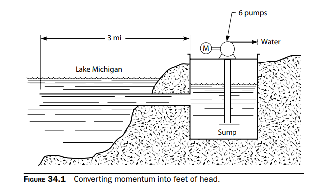 To explain this concept of converting speed or velocity into feet of head, let’s look at Fig. 34.1. This is the water intake section of the Chicago Water Treatment Plant. Water flows from Lake Michigan into a large concrete sump. The top of this sump is well above the level of Lake Michigan. The line feeding the sump extends three miles (3 mi) out into the lake. The long line is needed to draw water into the plant, away from the pollution along the Chicago lakefront. The pipeline diameter is 12 ft. Water flows in this line at a velocity of 8 ft/s. Six pumps, stationed atop the concrete sump, pump water into the water treatment plant holding tanks.