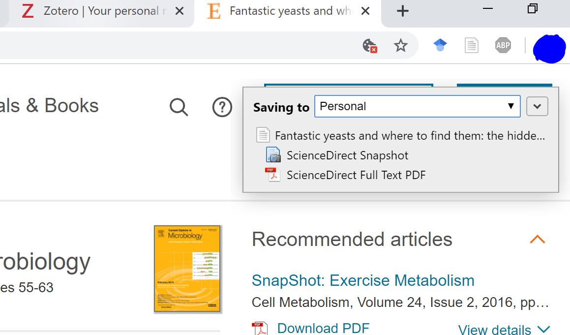 Let’s say I have a journal article on my web-page open. If Zotero is running in the background, I can download the current article (the website link plus the full pdf) with a single click. It looks like this: