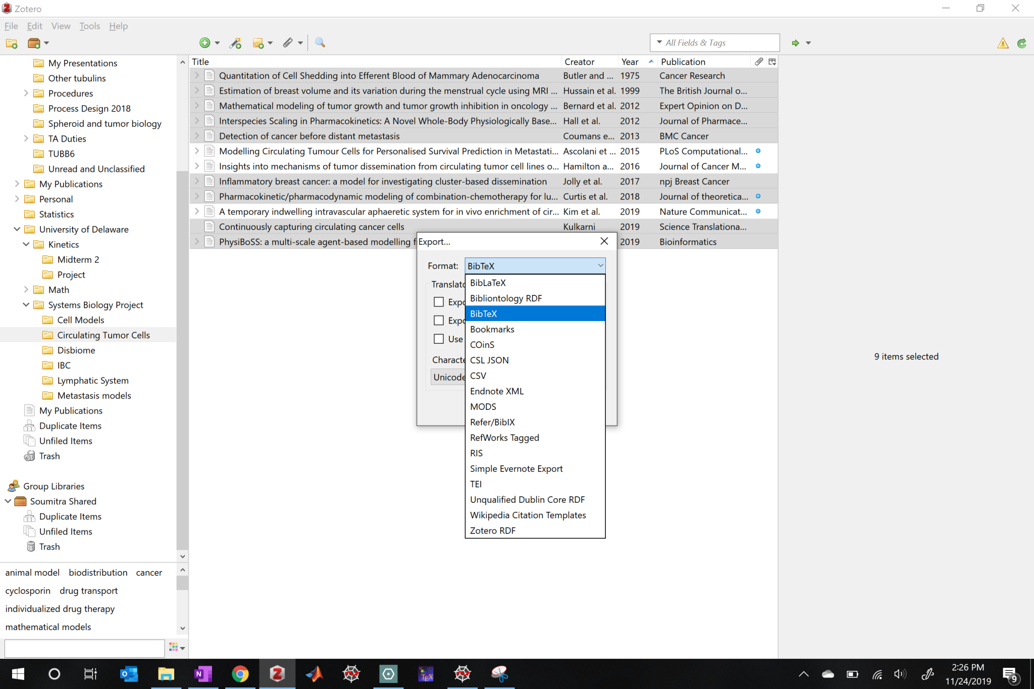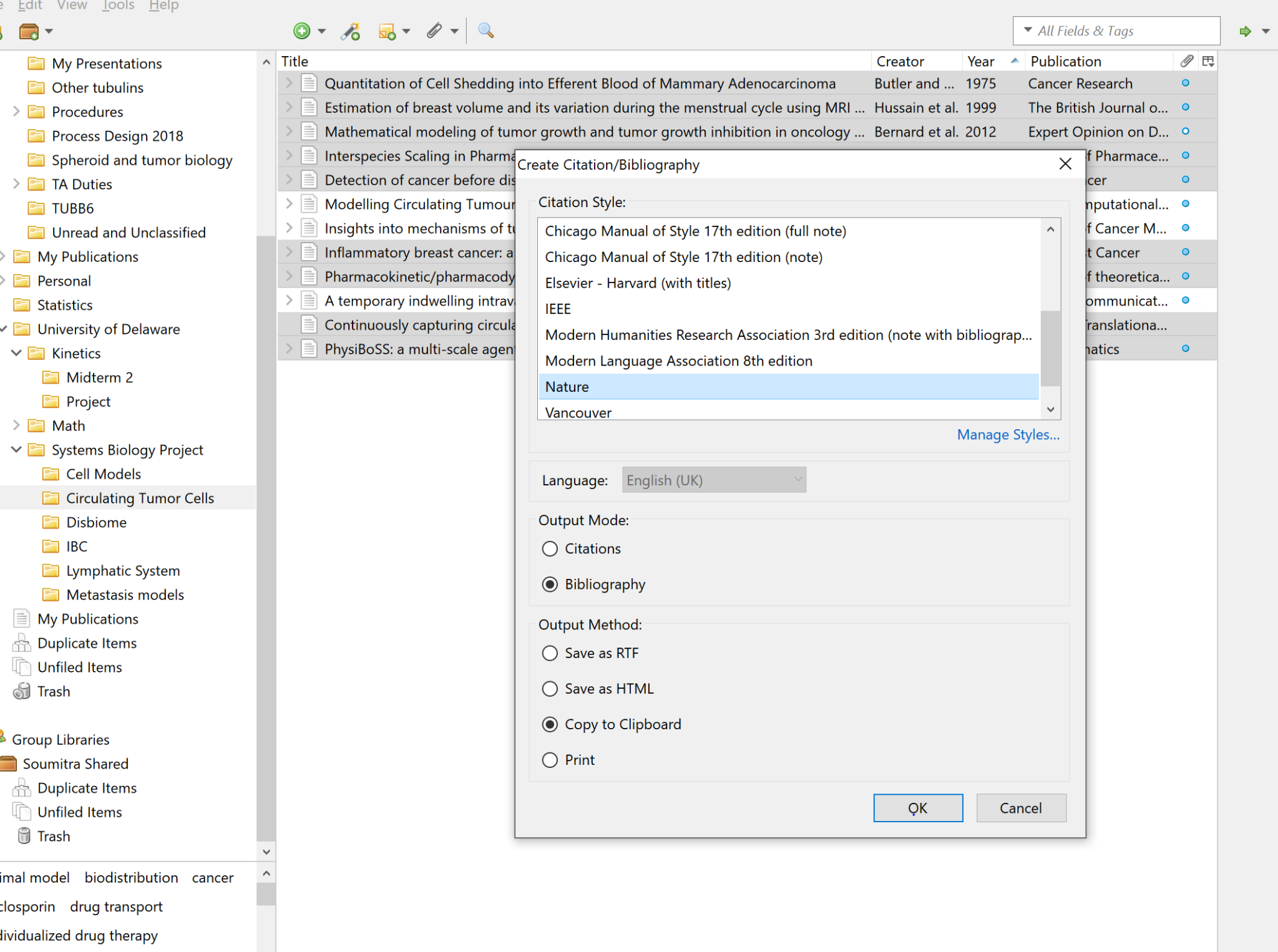 Select any or all of the papers in a folder or subfolder, right-click and choose ‘create bibliography’. Done. In a bunch of different styles. Oh, also, if you’re a LaTex user, you can export the selection as a BibTex or BibLatex file as well.